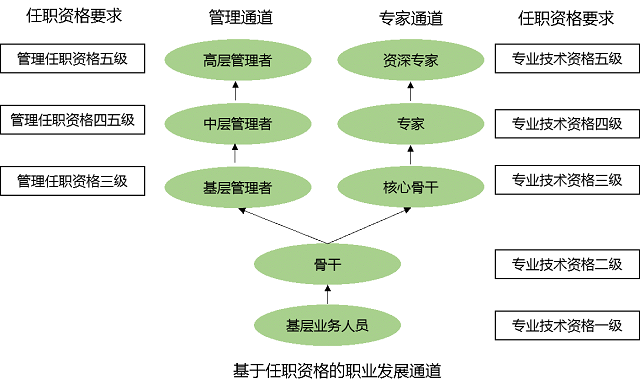 任职资格与职位相结合,为员工提供了职业发展通道。通过任职资格管理的牵引,形成管理和专业/技术两条职业发展通道。华为职业发展双通道如图所示。