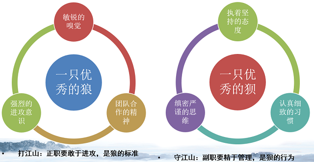 我们熟悉的阿里的政委体系和华为针对办事处建设的狼狈计划本质上都属于团队互补。华为的狼狈计划源自于狼与狈的生理行为归纳:狼有敏锐的嗅觉、团队合作的精神、不屈不挠的坚持。狈因为个子小,前腿短,在进攻时不能独立作战,因而它跳跃时是抱紧狼的后部,一起跳跃,就像舵一样的操控狼的进攻方向。而且,狈很聪明,很有策划能力,很细心,它就是市场的后方平台。