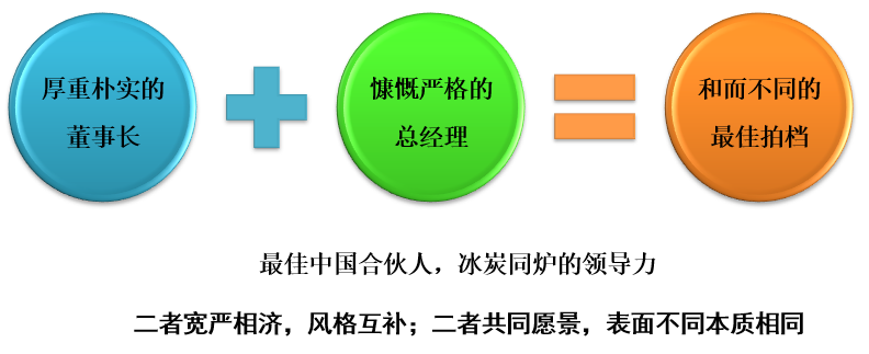 除了企业进行的人才盘点外,管理者个人也要充分了解正确认识自身优劣势。对自我有充分认知后,每个管理者尤其是一把手需要认真思考,自己不擅长的事,谁来做更合适?能够找到合适的人来搞定自己不擅长的事,非常关键。很多成功的企业,其核心经营团队都有很强的互补性,涌现出了一些列最佳搭档:华为任正非与孙亚芳、海尔张瑞敏与杨绵绵、格力朱江洪与董明珠等。合易咨询战略客户六个核桃的姚董事长和范总经理也是一对最佳搭档。
