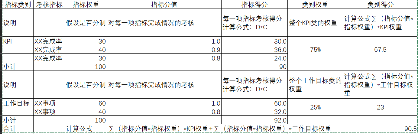 个人绩效分值=∑(KPIi绩效分值×KPIi权重)×KPI总权重+∑(工作目标完成分值×权重)×工作目标总权重,从公式中可以看出,整体绩效得分由两部分组成,一部分是KPI,另外一部分是工作目标,在这里KPI总权重和工作目标总权重是用于将KPI得分与工作目标得分归一化处理的权重。所以,如果是百分制的,则KPI部分的得分和工作目标部分的得分都应该是100分,才可以使用这个公式。具体见附表