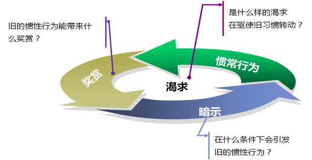关键在于:需要事先认真思考旧习惯的奖赏和暗示信息,即旧的惯性行为能带来什么奖赏,在什么条件下会引发旧的惯性行为,是什么样的渴求在驱使旧习惯转动。如果我们保持同样的暗示和奖赏,就能被植入一种新的惯常行为。