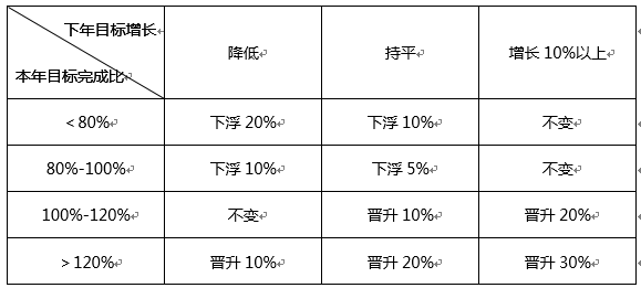 其次我们要考虑年薪的晋升。年薪标准制定之后并非是固定不变的,可以根据年度业绩目标完成的情况设计晋升或下浮的标准,以起到中期激励作用。最简单的方式是直接晋升或下浮,如本年度业绩指标超额完成10%,则下一年度年薪标准增长5%;本年度业绩指标完成不足80%,则下一年度年薪标准降低10%。复杂一点的方式就是结合本年度业绩目标完成情况及下一年度的目标增长比例,双重指标确定下一年度的年薪标准,直接一点的说就是不仅今年完成的好,明年的目标更好,那么年薪才能更高。举例如下: