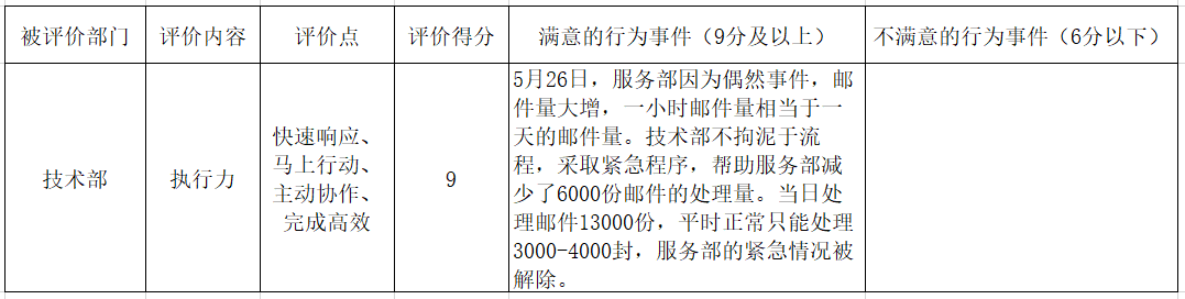 比较好的关键行为事件举例为:5月26日,服务部因为偶然事件,邮件量大增,一小时邮件量相当于一天的邮件量。如果不及时处理,将会影响客户的满意度和新上线产品的销量。技术部不拘泥于流程,采取紧急程序,帮助服务部减少了6000份邮件的处理量。当日处理邮件13000份,平时正常只能处理3000-4000封,服务部的紧急情况被解除。
