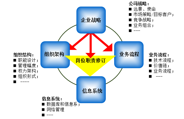 岗位分析顾名思义就是通过盘点现有各部门所需承担的总的职能和分项职责,梳理各岗位的岗位职责。然而,梳理各岗位的岗位职责仅仅是岗位分析的开始,还要结合公司的战略、组织架构、业务流程与信息系统,然后对岗位职责进行修订(如下图所示:),修订完成后进入下一阶段:岗位设计。