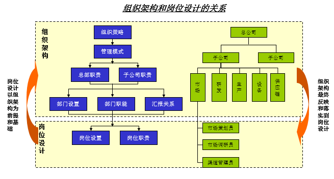 岗位设计通常是以企业的组织架构为前提的,脱离了公司现有组织架构的岗位设计,将是“空中楼阁”。我们可以通过下图来帮助我们理解组织架构与岗位设计的关系。