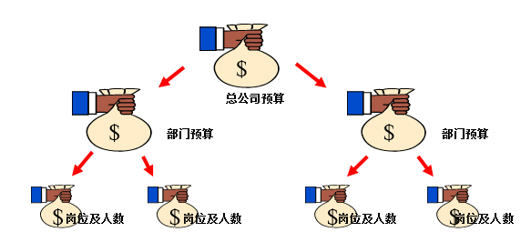 预算控制法西方企业流行的定编方法(如下图所示:),它通过人工成本预算控制在岗人数,而不是对某一部门内的某一岗位的具体人数做硬性的规定。部门负责人对本部门的业务目标和岗位设置和员工人数负责,在获得批准的预算范围内,自行决定各岗位的具体人数。由于企业的资源总是有限的,并且是与产出密切相关的,因此,预算控制对企业各部门人数的扩展有着严格地约束。
