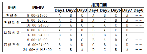 值得一提的是,采用德尔菲法与管理层沟通时,一定要事先了解各岗位的工作内容与班次,这对定编人数优化非常有益。比如:两个班组的岗位工作内容与工作强度近乎相同,一个班组的班制为四班三倒,另一个班组的班制为四班两倒,完全可以将两个班组的班制都统一为四班两倒,从人数上来说,一个班次至少减少1人。关于各类中班次的排版如下表所示:
