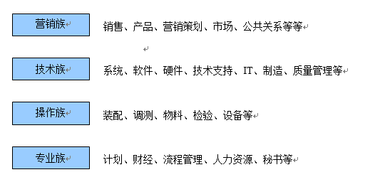 我们基于组织的价值流程,通过职位分析,把工作性质相同或任职素质相同的职位归为一族,即职位族。如处于不同机构的行政人员,具体的工作内容虽然不同,但工作性质基本一样,即利用专业知识来支持本机构的日常运转。