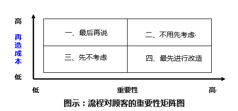 第四象限:对顾客非常重要,实施成本也很低,应该首先进行再造。