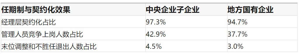“国企三项制度改革覆盖率统计表”可以看出,国央企子公司经理层契约化占比高达94%以上,但管理人员竞争上岗人数却不足50%,而末位调整和不胜任退出人数占比不足10%。